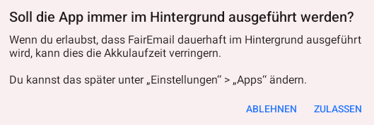 Falls sie vorhin erlaubt haben, dass FairEmail sie bei neuen Mails benachrichtigt, werden sie hier wohl Zulassen klicken. Es macht nicht viel Sinn, auf Benachritigungen zu hoffen, wenn FairEmail nicht im Hintergrund neue Mails abholen darf...